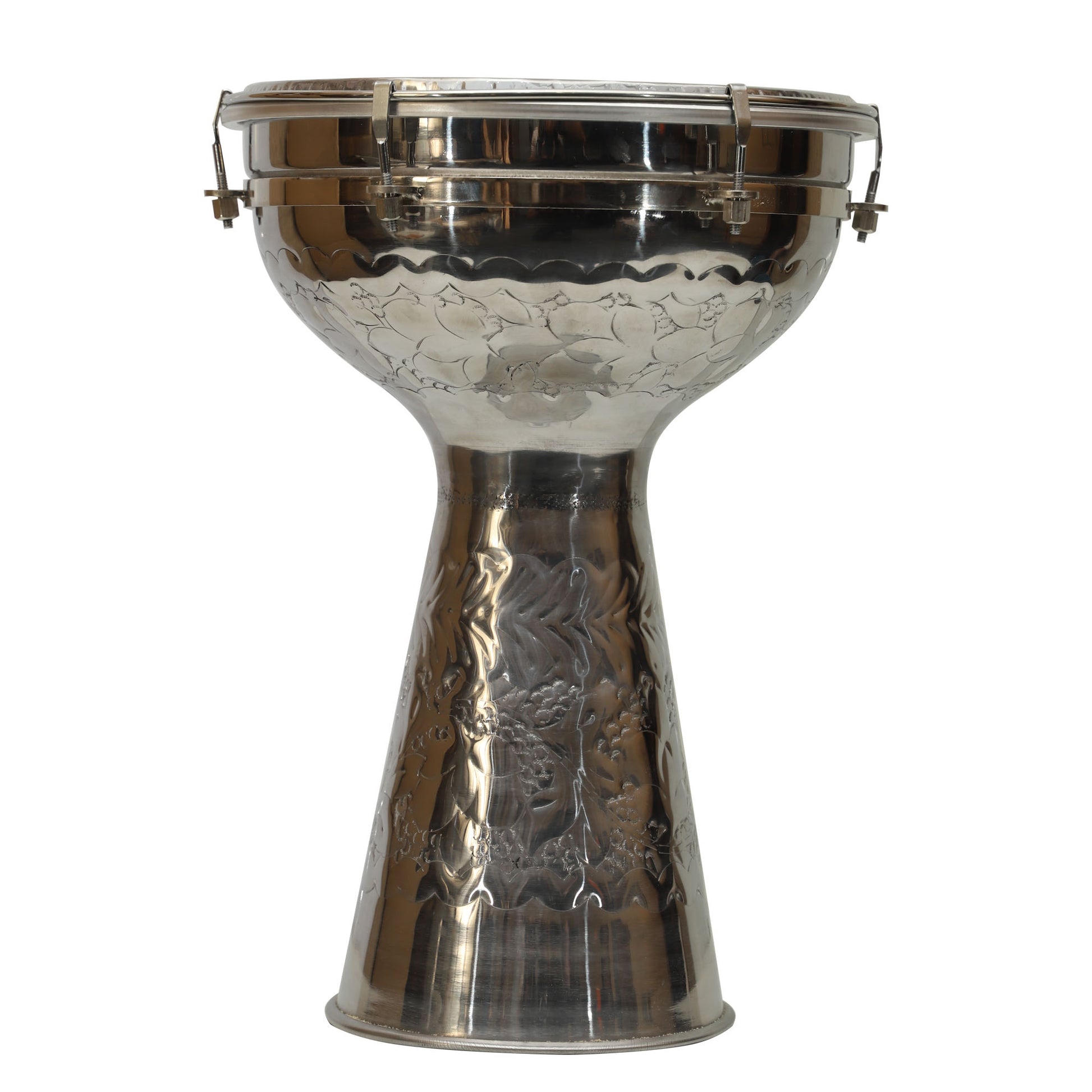 “Metal Doumbek” by Mid-East, 8”x14” with Synthetic Head. This instrument features a nickel-plated metal body and a standard synthetic head. The head is adorned with intricate floral patterns. The instrument is tunable using bolts and comes with either a clear or opaque synthetic head. Additionally, a tuning wrench is included for easy adjustment.