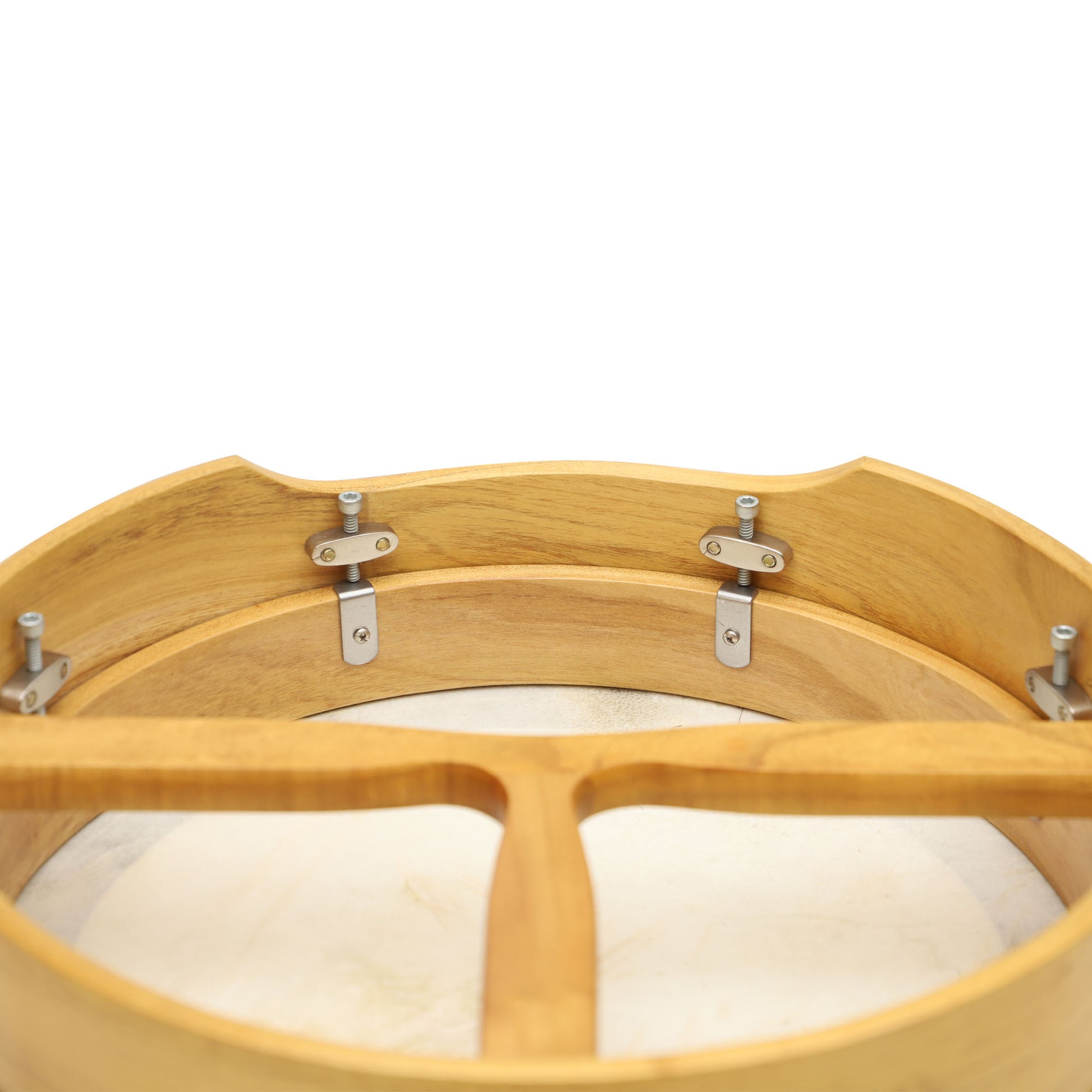 Bodhran, 14" x 3.5" Tunable Inside, Mulberry removable T- bar. Bolt tuning is hidden on the inside of the frame. A Goatskin head is mounted a mulberry frame with natural finish. Features a black band around frame. Includes a tipper and a tuning wrench.